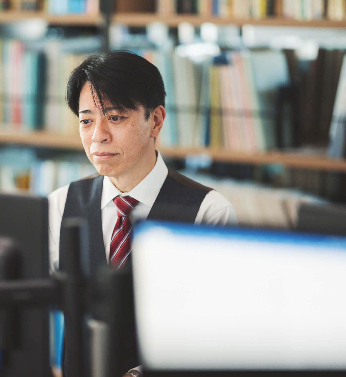 デスクについたらメールチェックから。メールの返信をしつつ、その日に行う会議の予定を整理します。また、部下や関係部署からの報告や問い合わせを受け、対応方針を提示します。 - 資料作成